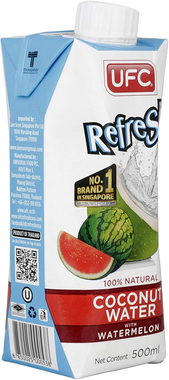 Ufc Refresh 100 Natural Coconut Water Ntuc Fairprice. 100% naturally from thailand's coconut belt areas where the best. 2 cups coconut water 1/4 cup raw white chia seeds 2 teaspoons matcha powder 2 tablespoons manuka honey from pacific resources international. No added flavours, preservatives or sugar. Coconut water 94.9%, fresh watermelon juice 5%, natural fruit flavor, vitamin c. Coconut water is an amazing way to stay fresh so you can capture every moment of your day. Refresh is packed with 5 essential electrolytes (potassium, calcium, phosphorus, magnesium and sodium). Coming soon to super a foods. Refreshing cocktail gin and coconut water 1 1/2 ounces dry gin 1 1/2 ounces ufc coconut water 3/4 ounce fresh lime juice dash pressed ginger juice large ice cubes fresh lime wedge for garnish buy ufc refresh. Select products ufc refresh ufc velvet ufc soupe ufc fruit juices nectar (canned juice & drink) coffee canned fruit canned vegetable sauces & seasoning. Has been added to your basket. What are you waiting for? Ufc refresh coconut water 500 ml. Ufc refresh coconut water is now available in 200ml size and ufc refresh watermelon water in 180ml size. Compared to other coconut waters While every care has been taken to ensure product information is correct, food products are constantly being reformulated, so ingredients, nutrition content, dietary and allergens may change.